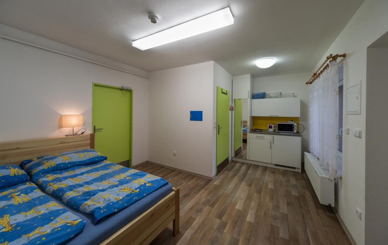 V pokoji se nachází jedno dvoulůžko, s možností dětské postýlky, kuchyňská linka s mikrovlnou troubou, varnou konvicí a lednicí, jídelní stůl. Součástí pokojů je bezbariérová koupelna s WC, zrcadlem a umyvadlem. Součástí pokoje šatní skříň.